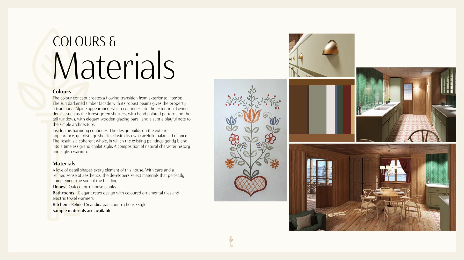 High-quality oak floorboards, carefully selected natural materials and the harmonious combination of modern architecture with alpine charm give this home a warm, elegant and timeless atmosphere. The kitchen features a luxurious country house design, while the stylish bathroom with shower, ornaments and coloured tiles conveys a feeling of wellness and comfort.