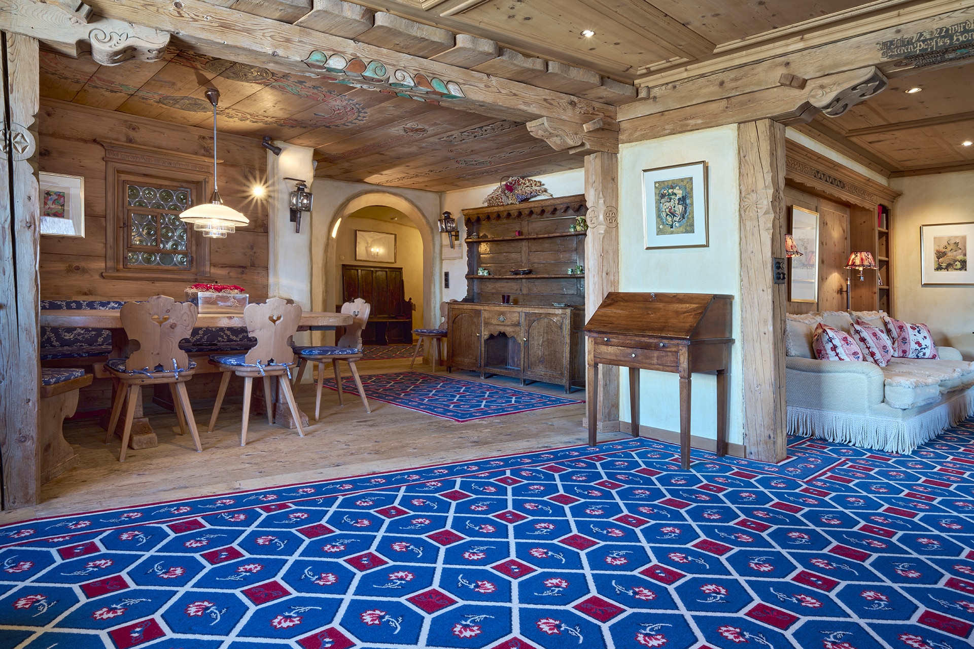 In a privileged south-west location, right in the heart of Klosters, this exceptional residence on the first floor welcomes you with the charm of a historic chalet and a palpable, cultivated exclusivity. Warm wooden floorboards, ornate carvings and original antique doors tell the story of Alpine history and lend the home an unmistakable grand chalet atmosphere.