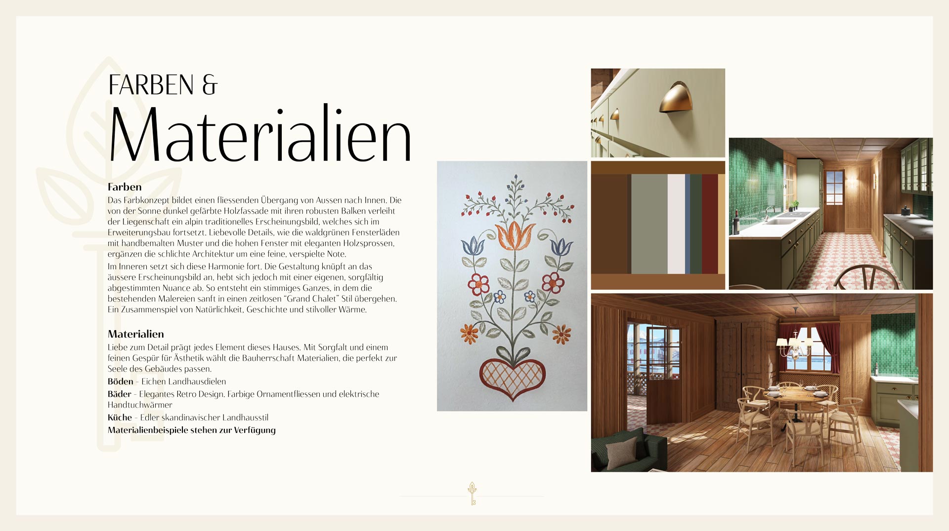 Hochwertige Eichendielen, sorgfältig ausgewählte Naturmaterialien und die harmonische Verbindung von moderner Architektur mit alpinem Charme verleihen diesem Zuhause eine warme, elegante und zeitlose Atmosphäre. Die Küche präsentiert sich in luxuriösem Landhausdesign, während das stilvolle Badezimmer mit Dusche sowie Ornament und Farbfliesen ein Gefühl von Wellness und Behaglichkeit vermitteln.