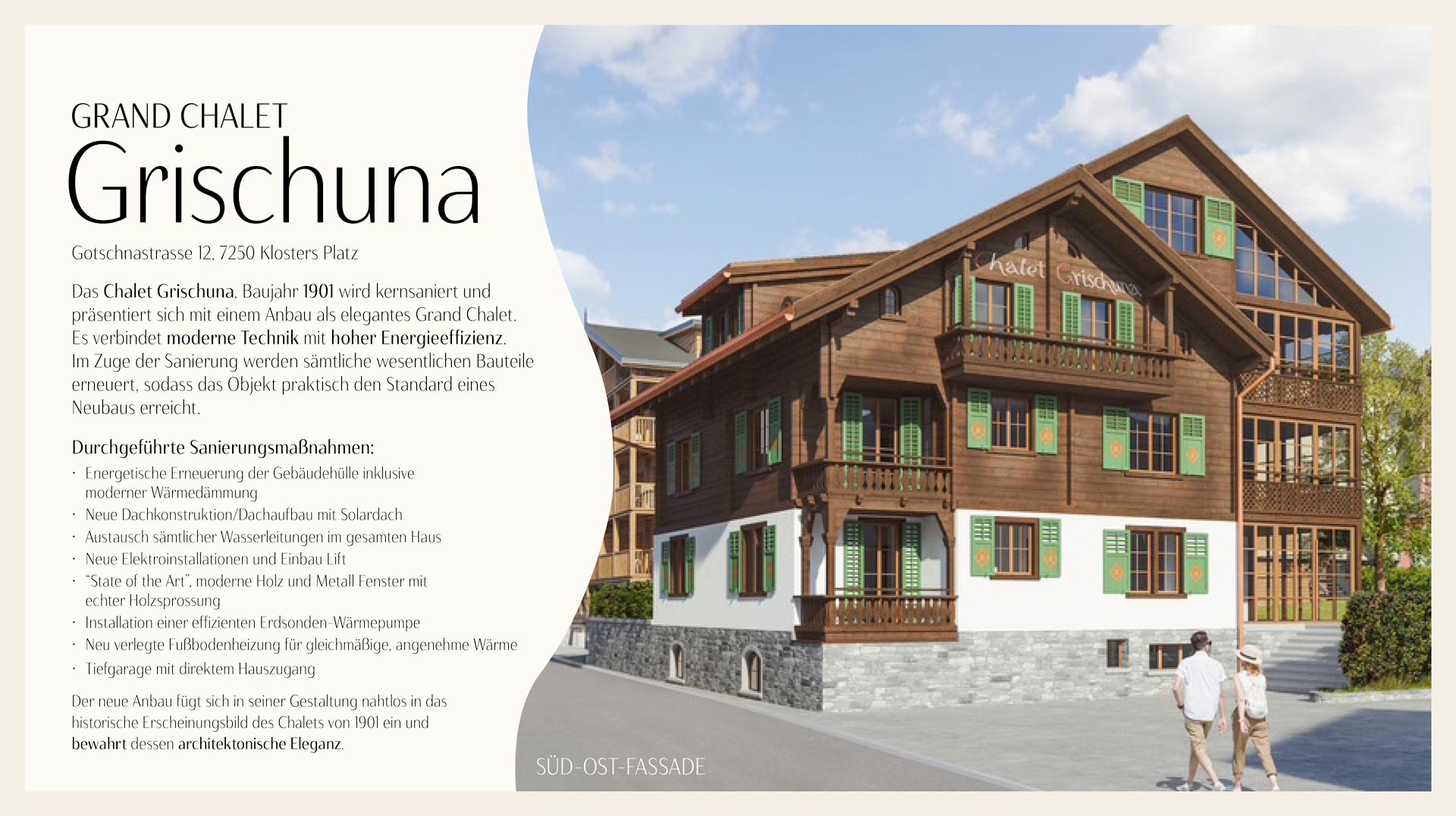 An der Gotschnastrasse 12 entsteht eine exklusiv, bewirtschaftete Wohnung im Erdgeschoss des Grand Chalet Grischuna. Ausgebaut im edlen skandinavischen Landhausstil, gestaltet mit viel Liebe zum Detail und hochwertigen Materialien.